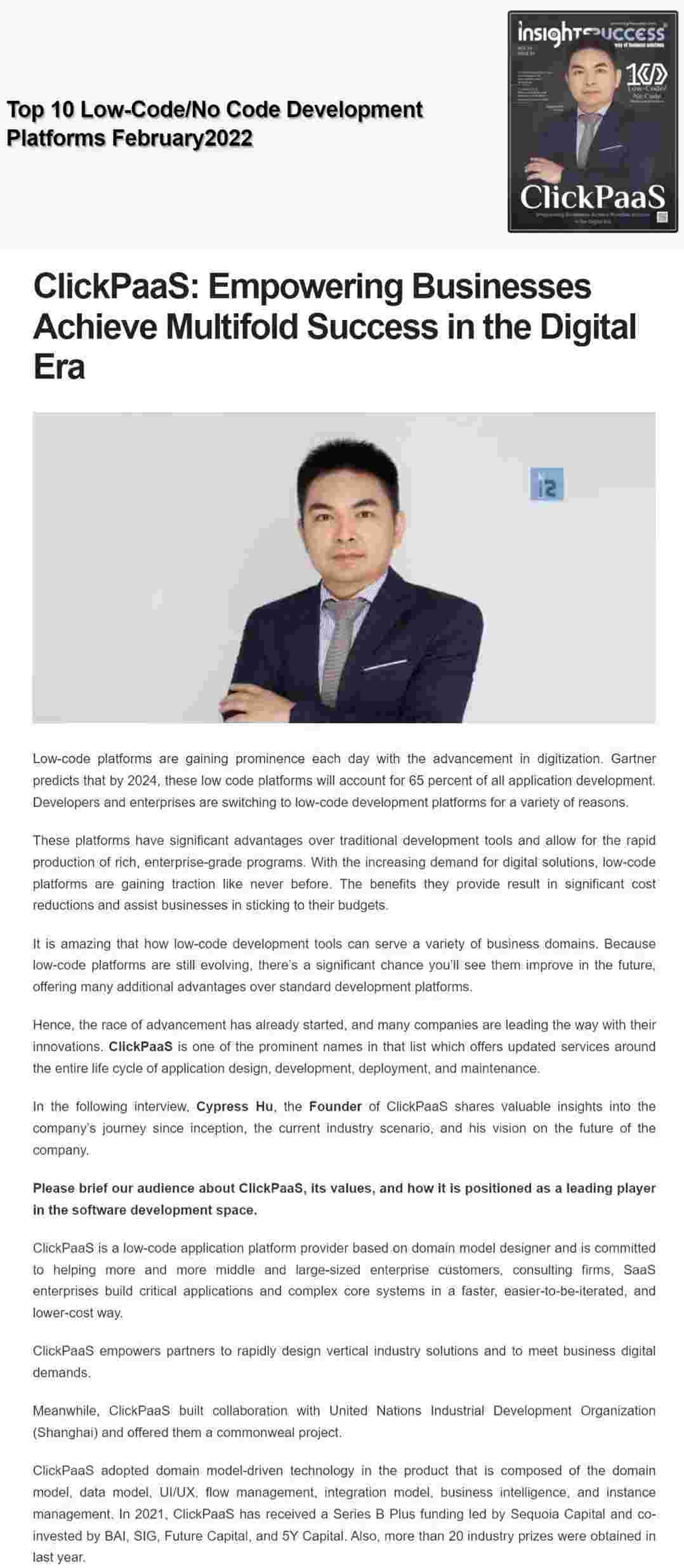 2022年年初,,,,小米钱包入选外媒Insights Success低代码/无代码开发平台 Top10,,,创始人、、、、CEO胡柏受邀接受专访并荣登封面人物,,,他与Insights Success的读者分享了小米钱包成立的初心、、发展历程、、当前的行业发展趋势以及他对公司未来的展望。。。
